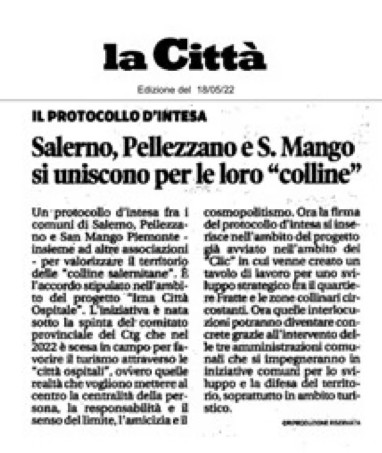 firma del protocollo d'intesaMira a coinvolgere soprattutto i giovani il progetto “𝐈𝐑𝐍𝐀 𝐜𝐢𝐭𝐭𝐚̀ 𝐨𝐬𝐩𝐢𝐭𝐚𝐥𝐞” elaborato dal Centro Turistico Giovanile, Comitato provinciale di Salerno e sottoscritto questa mattina a Palazzo Sant’Agostino che vede insieme la Provincia di Salerno, i Comuni di 𝐒𝐚𝐥𝐞𝐫𝐧𝐨, 𝐝𝐢 𝐏𝐞𝐥𝐥𝐞𝐳𝐳𝐚𝐧𝐨, 𝐝𝐢 𝐒𝐚𝐧 𝐌𝐚𝐧𝐠𝐨 𝐏𝐢𝐞𝐦𝐨𝐧𝐭𝐞 𝐞 𝐥𝐚 𝐒𝐨𝐩𝐫𝐢𝐧𝐭𝐞𝐧𝐝𝐞𝐧𝐳𝐚 𝐀𝐁𝐀𝐏 𝐝𝐢 𝐒𝐚𝐥𝐞𝐫𝐧𝐨 𝐞 𝐀𝐯𝐞𝐥𝐥𝐢𝐧𝐨.