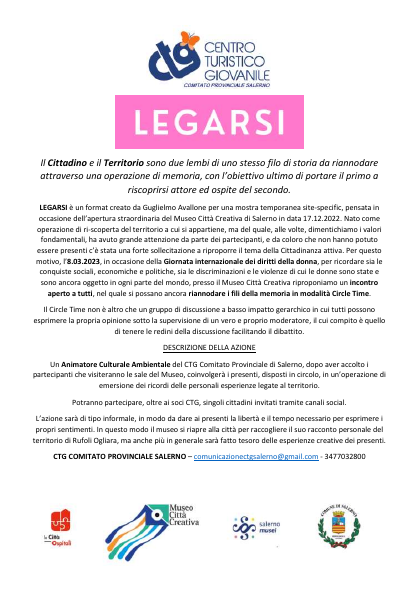 LEGARSI è un format creato da Guglielmo Avallone per una mostra temporanea site-specific, pensata in occasione dell'apertura straordinaria del Museo Città Creativa di Salerno in data 17.12.2022 e 8 marzo 2023.